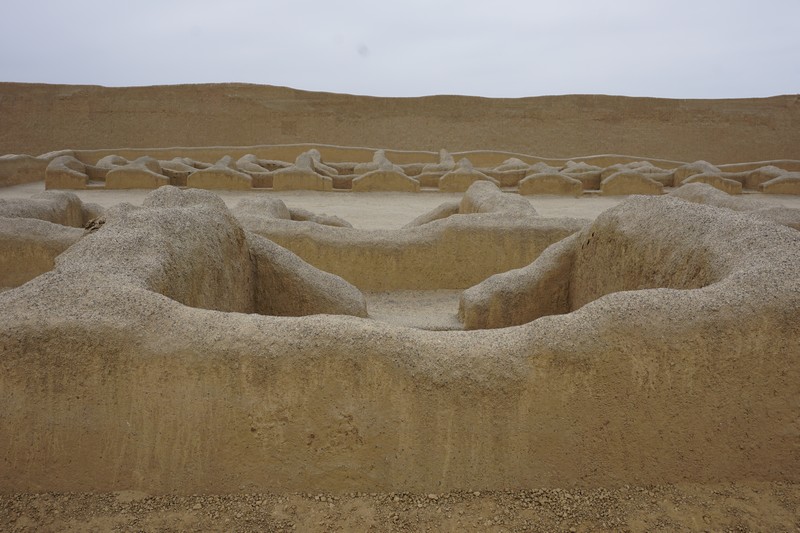 Chan Chan is a ruin quite different than those we’ve visited so far. It is made of adobe rather than stone and as you might guess much of the infrastructure has essentially melted away in the rain and weather. That being said the city state is the largest pre-Columbian city in the Americas and the largest adobe city on the planet. What does remain is remarkably well preserved and the detail of the friezes on the edifices is astounding. The walls around the citadel we visited were massive at 4 meters thick and once stood over 10 meters high. Chan Chan was home to the Chimu Empire whose population at its peak was estimated at 60,000 inhabitants. Built around AD 1300, it is relatively young compared to other ruins we’ve visited. It’s hard to believe that anything is left of this mud fortress after 700 years.
